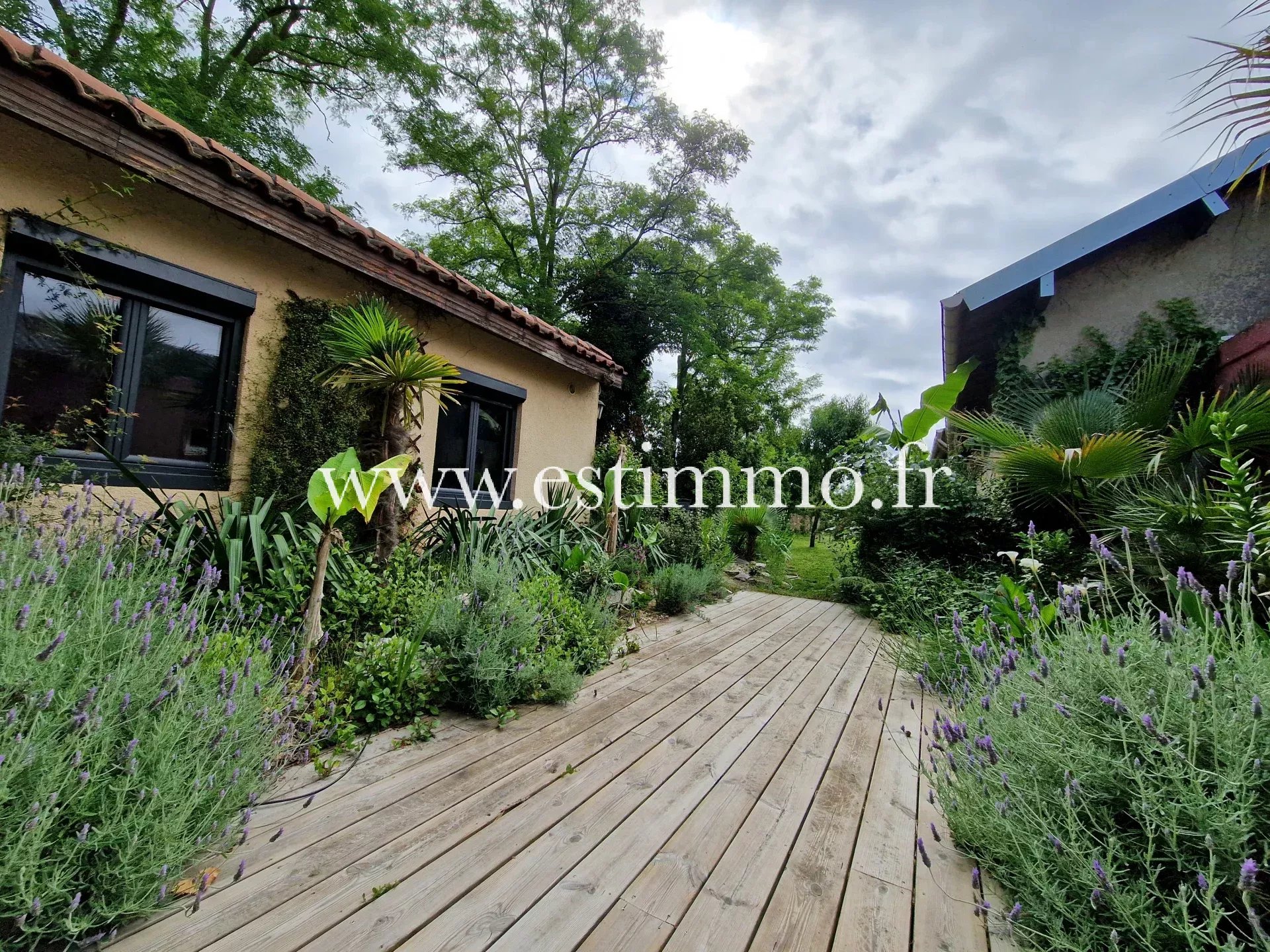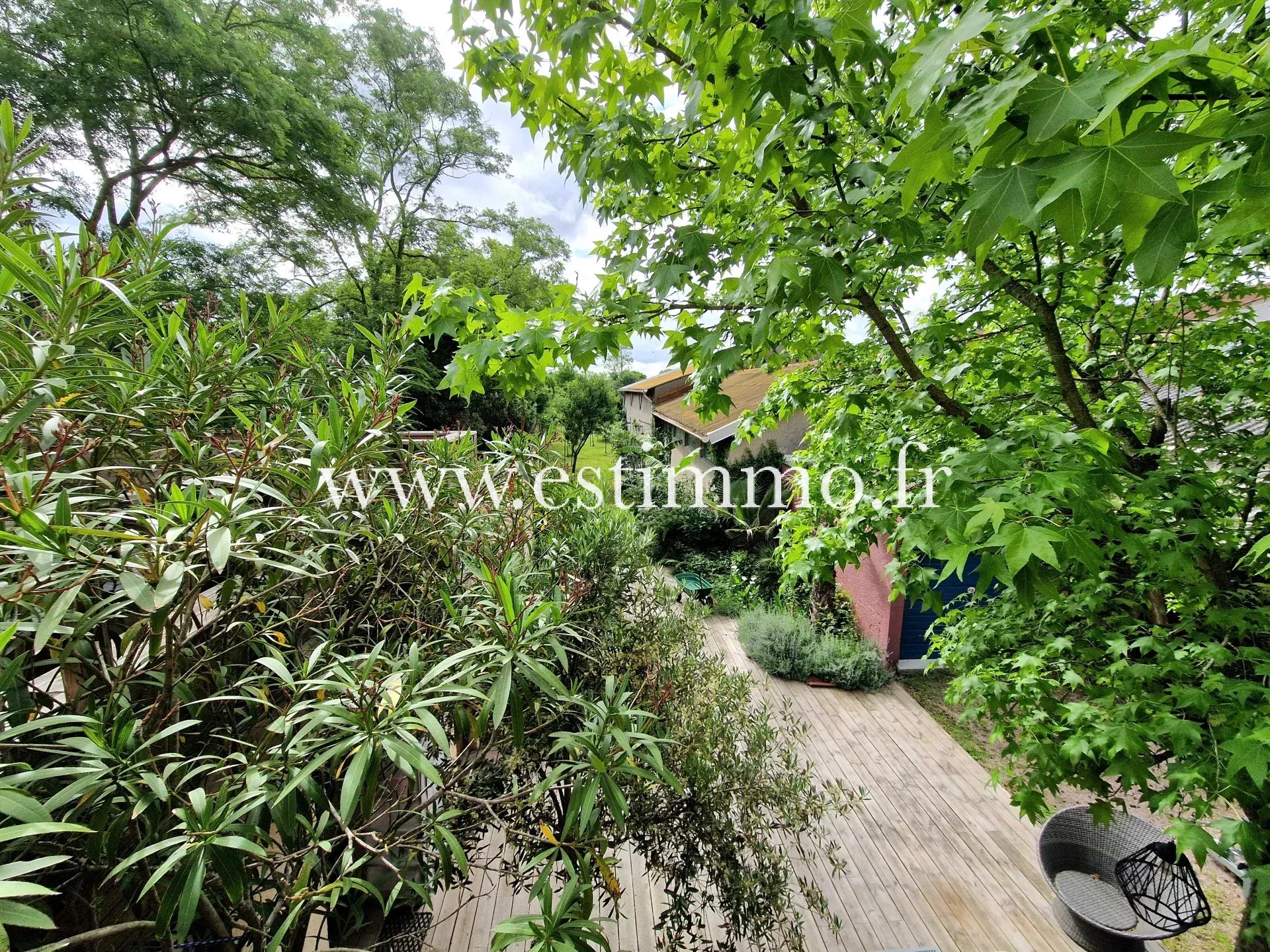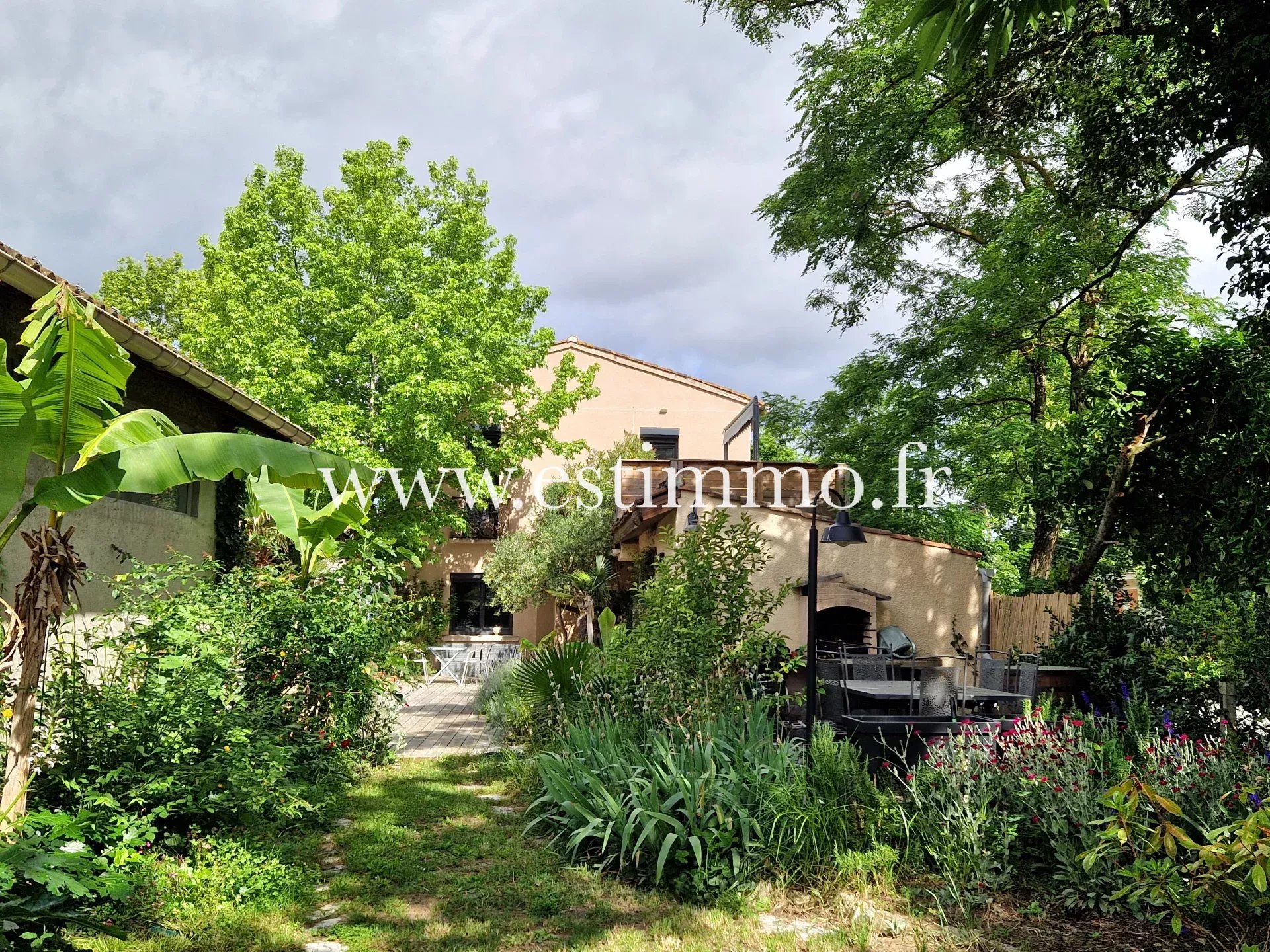 Cugnaux, charmante et lumineuse maison de ville dans un écrin de verdure de 911 m2. Elle développe 224 m2 habitables sur 2 niveaux. Au rez-de-chaussée, cuisine familiale entièrement équipée et aménagée et sa salle à manger attenante, une triple réception de 63 m2 environ, une lingerie/chaufferie. L'étage climatisé distribue 3 belles chambres, une suite parentale avec sa salle d'eau s'ouvre sur une terrasse privative surplombant le jardin. Une salle d'eau supplémentaire. Un studio attenant avec salle d'eau est totalement indépendant. Un vaste garage et possibilité également de se garer sur la parcelle. Au calme absolu et à proximité de toutes les commodités. Bien rare. ESTIMMO 0561544305.www.estimmo.fr